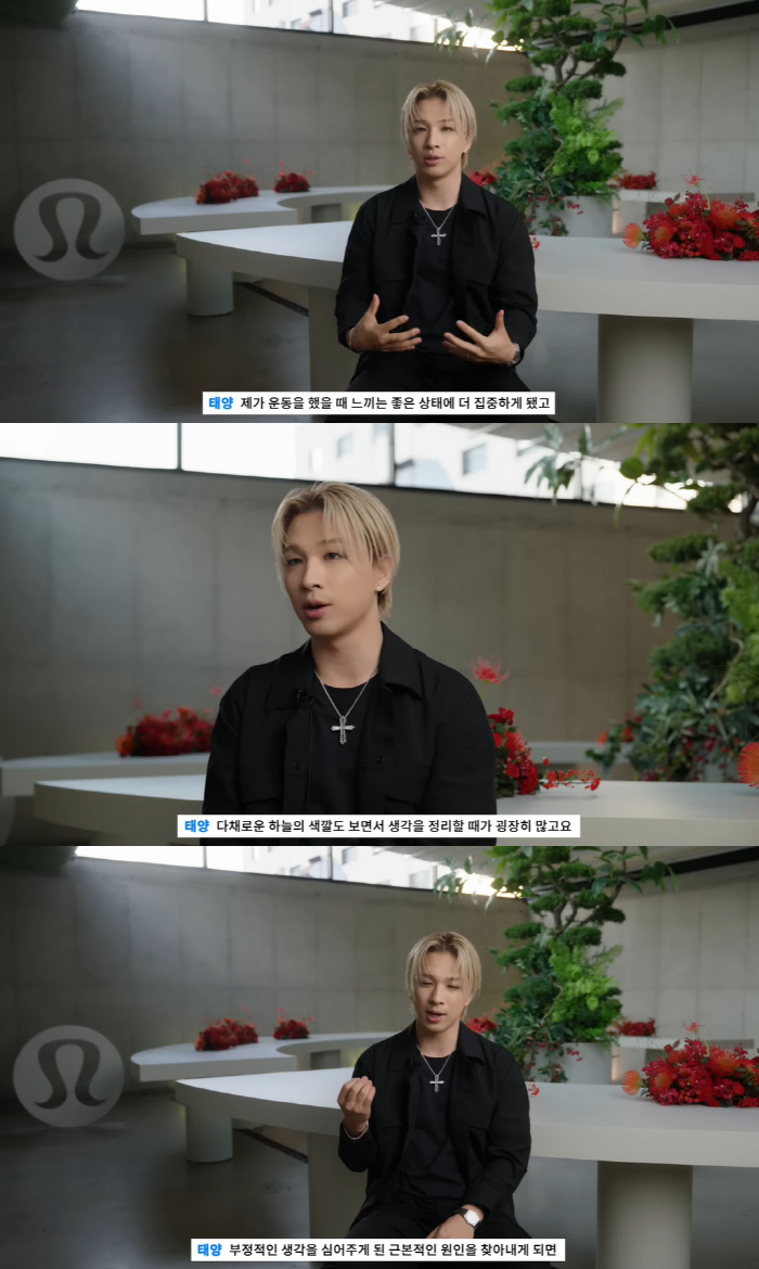 자신만의 스트레스 해소 방법에 대해서는 "산책을 주로 하는 편"이라며 "변화하는 계절의 풍경을 보고 다채로운 하늘의 색깔을 보며 생각을 정리할 때도 많다"라고 이야기했다. 태양은 "더 좋은 방법은 마음이 맞는 사람과 이야기를 나누면서 제 생각을 공유하고 위로받는 시간이 큰 정신적 웰빙이지 않을까 생각한다"라고 털어놨다.