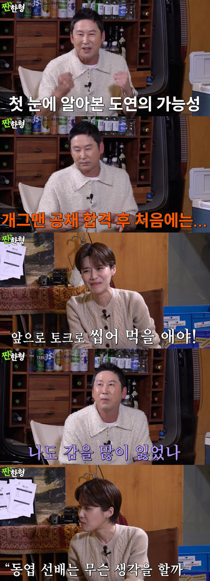 신동엽은 장도연이 몸 개그로 승부 보던 시절을 언급하며 "처음에 (그 모습을 보고) 내가 감을 많이 잃었다고 생각했다. 그래서 내가 PD 형한테 계속 얘기했다. '도연이는 토크가 최고다. 콩트도 잘하지만 예능 나가면 토크를 잘 할 거다'라고 했는데 계속 몸 개그를 하더라"고 말해 웃음을 자아냈다. 이에 장도연은 "급하니까 그랬다. 그래도 몸 개그 하면서 말은 했다"고 너스레를 떨었다.