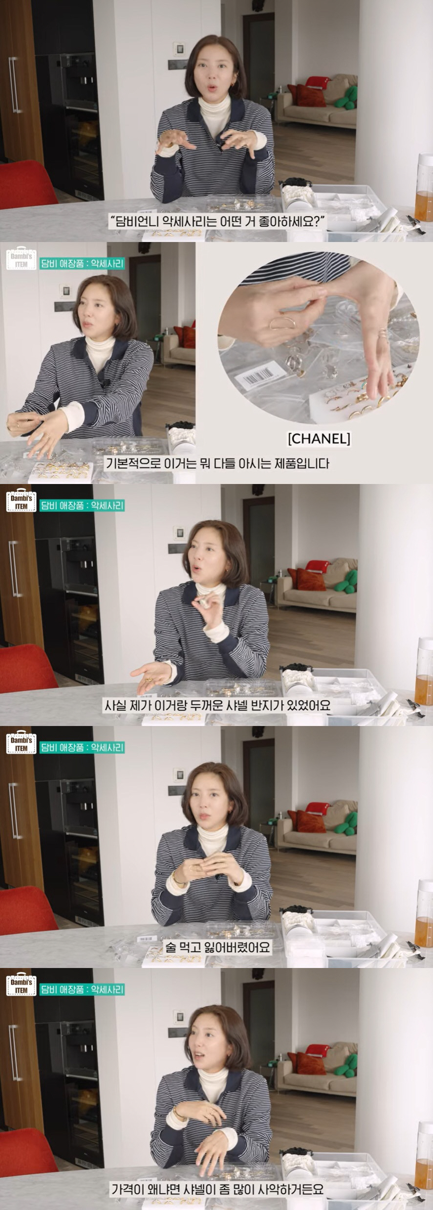 손담비는 "저는 엄지에 끼는 반지를 너무 좋아한다. 이거는 기본적으로 다 아시는 제품"이라며 C사 제품의 반지를 소개했다. 손담비는 "사실 이거랑 두꺼운 반지가 있다. 술 먹고 잃어버렸다. 너무 화가 많이 난다"며 "가격이 좀 많이 사악하다. 그래서 그때 큰맘 먹고 매장 가서 이거랑 두꺼운 반지랑 딱 이거를 샀다"고 같은 브랜드의 팔찌를 꺼냈다.