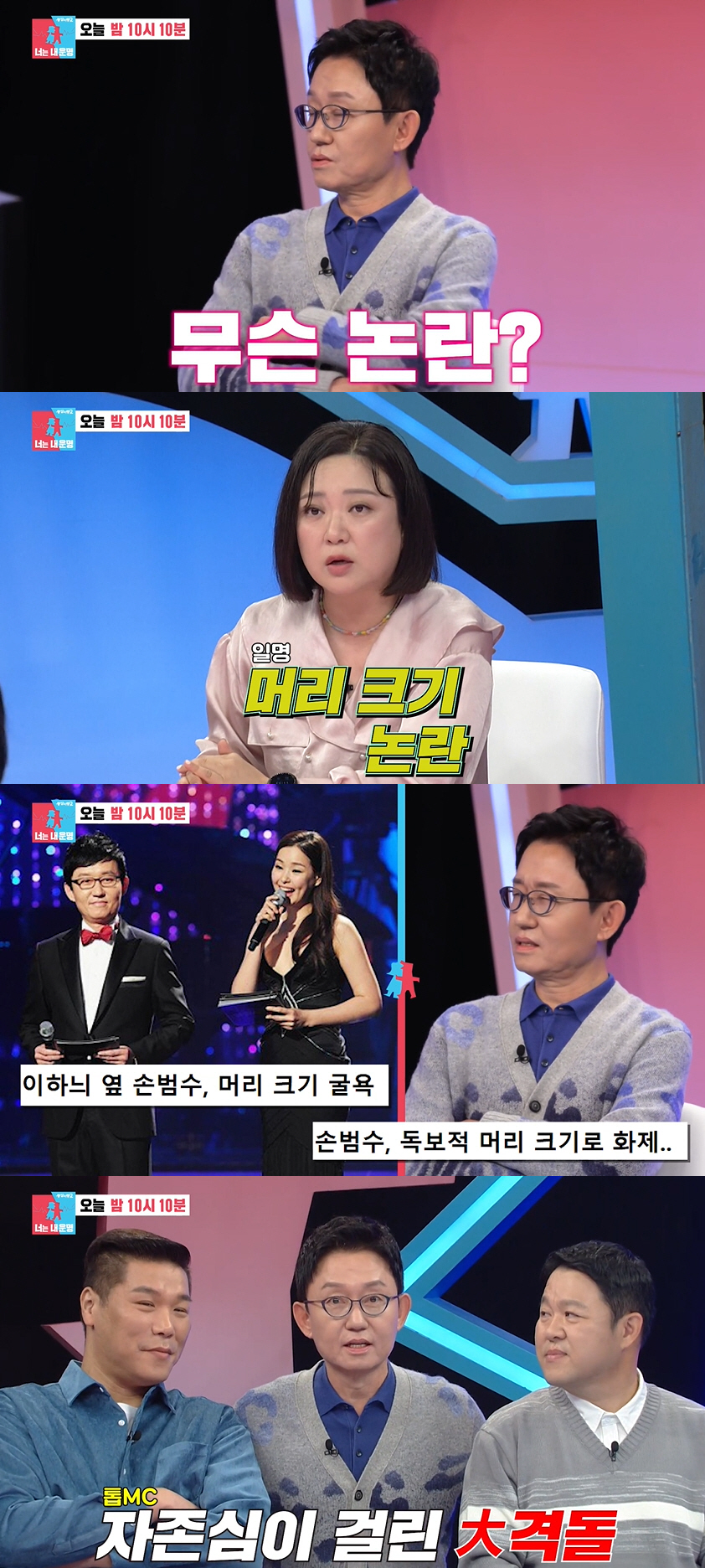 김숙은 "방송 경력 34년 동안 잡음 없이 쭉 오셨다. 그런데 지독하게 따라붙는 논란이 하나 있다"며 "머리 크기 논란이 있다"고 손범수를 놀렸다.