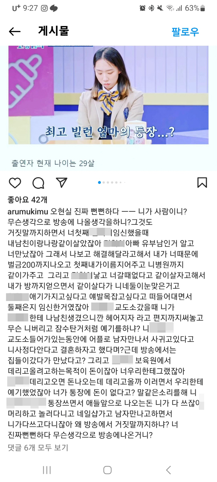 네티즌 A씨는 최근 자신의 개인계정에 오현실에 대한 장문의 글을 올렸다. A씨는 방송에도 등장했던 오현실의 둘째 아이 아빠 C씨의 전 여자친구다. A씨는 오현실이 첫째 아이 아빠인 B씨가 유부남인 것을 알고도 만남을 유지하다 아이를 임신했고, 갈 곳이 없다는 오현실의 말에 자신과 당시 남자친구였던 C씨까지 3명이 함께 동거를 하던 중 오현실이 의도적으로 C씨의 아이를 임신했다고 주장했다. 또 C씨가 교도소에서 복역 중인 가운데 어플을 통해 만난 D씨와 만났다며 오현실이 아이 아빠들과의 만남을 거짓말했다고 폭로했다.