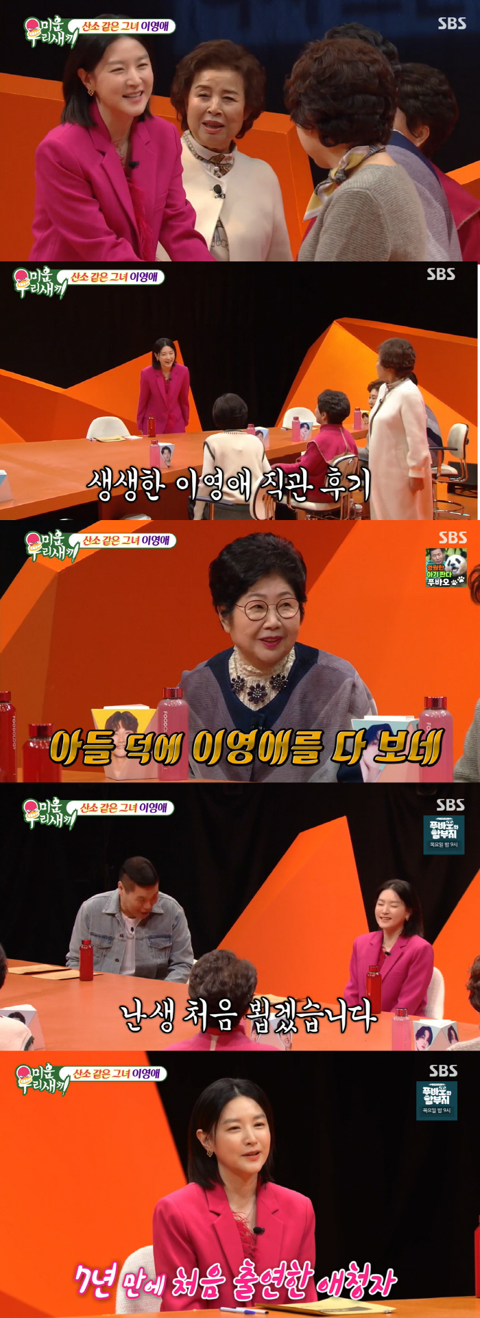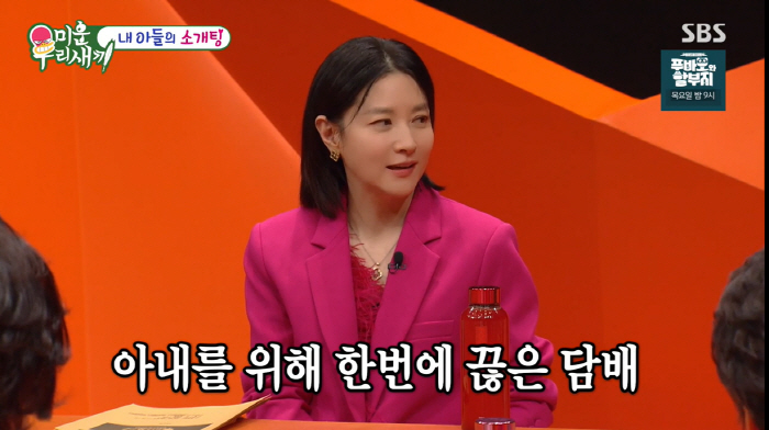 이날 이영애는 연애 때 남편에 대해 "지금 생각해보니 담배를 한번에 딱 끊었다"며 "사업하시니까 술 담배를 했었는데 한번에 딱 끊었어요"라고 수줍게 말했다. 그러면서 김승수 어머니에게 "걱정 안하셔도 될것 같다. 좋은 사람 만나면 딱 끊으실 것 같다"고 다정하게 말했다.
