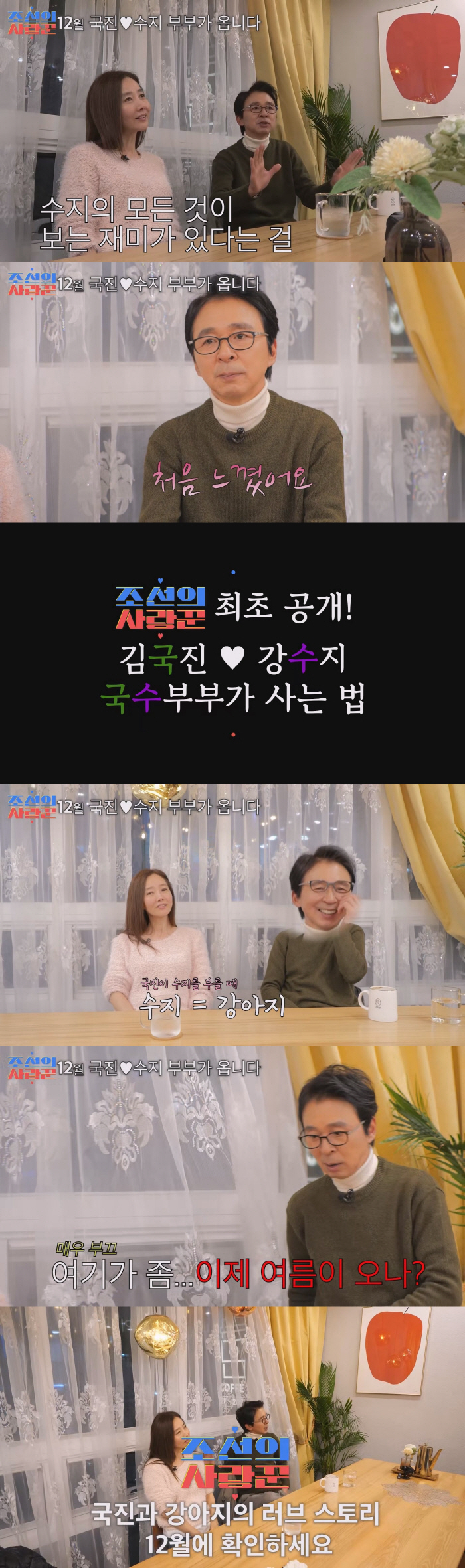 28일 '조선의 사랑꾼' 시즌2 제작진이 공개한 영상에 첫 등장한 김국진♥강수지 부부는 명불허전 '사랑꾼'다운 깨소금 향을 풍겼다. 우선 강수지는 "김국진 씨 부인 강수지입니다"라고 자기소개를 했고, 김국진은 "사랑을 알 듯 말 듯, 기어코 알아낸...강수지 씨와 같은 집에 살고 있는 김국진입니다"라고 말했다. 서로를 '부부'로 좀처럼 소개하지 않았던 두 사람은 시종일관 쑥스러움을 감추지 못했다. 그러면서도 김국진은 "수지 씨랑 지내다 보면 걸어다니고 움직이는 것조차 보는 재미가 있다. 삐친 모습조차...살면서 처음 느낀다"며 아내에 대한 남다른 애정을 드러냈다.
