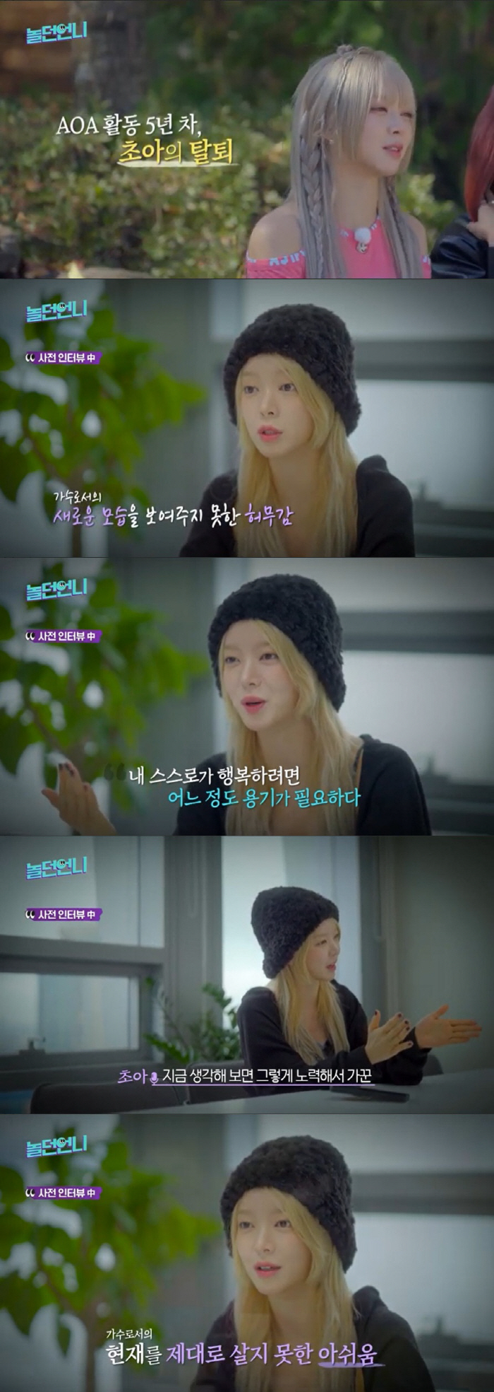 힘들게 데뷔한 AOA에서 5년 활동 후 탈퇴한 초아. 초아는 "내가 늦게 데뷔했으니까 잘해야 해 이런 생각이 있었는데 잘이라는 게 한도 끝도 없지 않냐. 두 번째로 1등을 했는데 허무하더라. 새로운 모습을 같은 사람이 계속 보여주는 게 어렵고 부정적으로 받아들여지면서 스스로 포기한 거 같다"며 "그때는 절이 싫으면 중이 떠나는 게 당연한 거고 내 스스로가 행복하려면 어느 정도 용기가 필요하다 생각해서 나갔다. 지금 생각해보면 그렇게 노력해서 가꾼 내 모습을 좋아해주시는 것만 해도 감사한 건데, 현재를 살지 못했다"고 토로했다. 하지만 멤버들과 싸운 적은 한 번도 없었다고. 언니들과 이야기하던 중 초아는 "저희는 한 번도 안 싸웠다. 일상 대화를 하더라도 불만 얘기를 안 했던 거 같다"고 밝혔다.