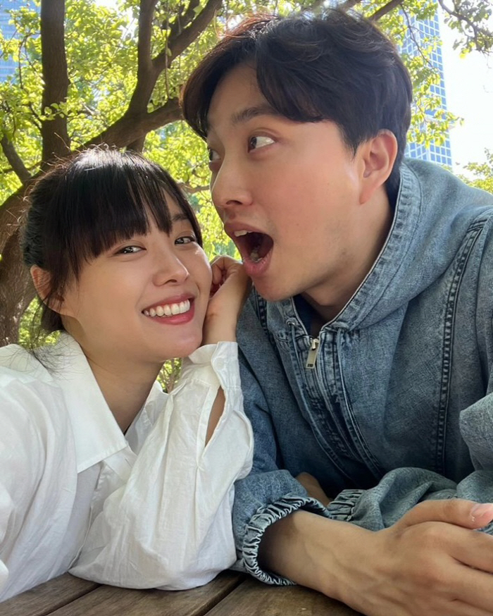 박위와 송지은은 다정한 포즈로 앉아 커플샷을 찍고 있는 모습. 카메라를 향해 미소 짓고 있는 송지은과 장난기 넘치는 표정을 짓고 있는 박위의 모습이 시선을 모은다.