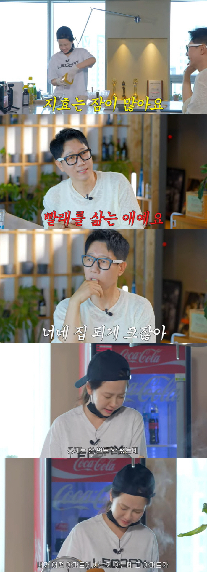 집에 짐이 많아 빨래를 널 곳이 없다는 송지효의 말에 지석진은 "너네 집 되게 크잖아. 공개는 안 됐는데 집이 되게 크다. 어떤 아파트에 사는지 아는데 그 아파트가 큰 평수밖에 없다"고 폭로했다.
