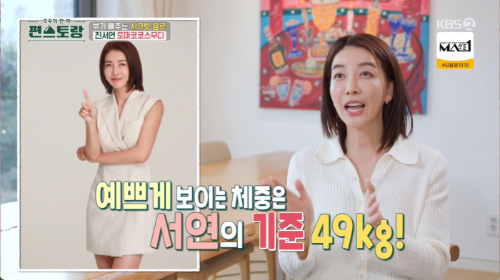 하지만 진서연은 "촬영 때 53kg면 안된다. 제가 먹는 걸 워낙 좋아해서 활동 안할 때의 몸무게다. 비수기에는 53~54kg다. 그리고 활동할 때는 48~49kg다"라 했다.