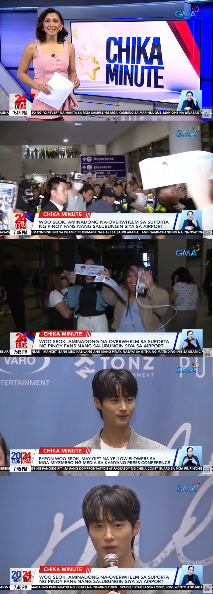 앵커는 "'Lovely Runner'(선재업고 튀어)의 남자 주인공 배우 변우석이 필리핀을 팬미팅을 위해 방문했다"며 "이 배우는 최근 K-Drama '러블리 러너'에 출연하여 한국 뿐만 아니라 아시아 전역에서 큰 인기를 얻었다. 공항에 수많은 팬들이 운집해 필리핀을 첫 방문한 한국 배우를 환영했다"고 소개했다.