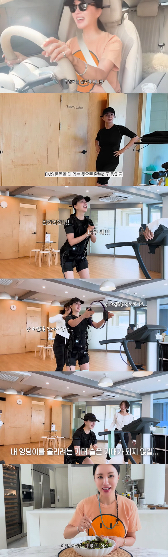엄정화는 "오랜만에 이제 휴가를 가기 전에 수영복을 입어야 되니까 EMS 운동, 전기자극 운동을 하러 간다"며 "진짜 단시간에 근육을 각성시켜 주는 데에는 굉장히 좋은 거 같다. 20분 운동하고 거의 40분 운동한 효과를 낼 수 있다"고 말했다. 이어 "특히 엉덩이 밑살과 가슴 업에는 정말 탁월한 거 같다. 엉덩이와 가슴을 올리러 간다"며 해맑게 웃었다.