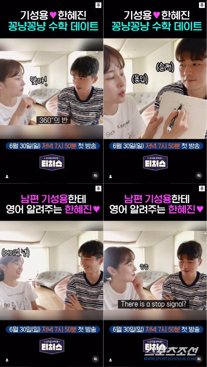 27일 오후 한혜진은 자신의 개인 계정에 "잘한다잘한다잘한다~ 가르치는 건 아무나 하는 게 아니네. 협조 감사드립니다"라는 글과 함께 두 개의 영상을 차례로 공유했다. 공개된 영상에서 한혜진은 남편인 기성용에 영어 문장과 수학 문제를 직접 가르치는 모습.