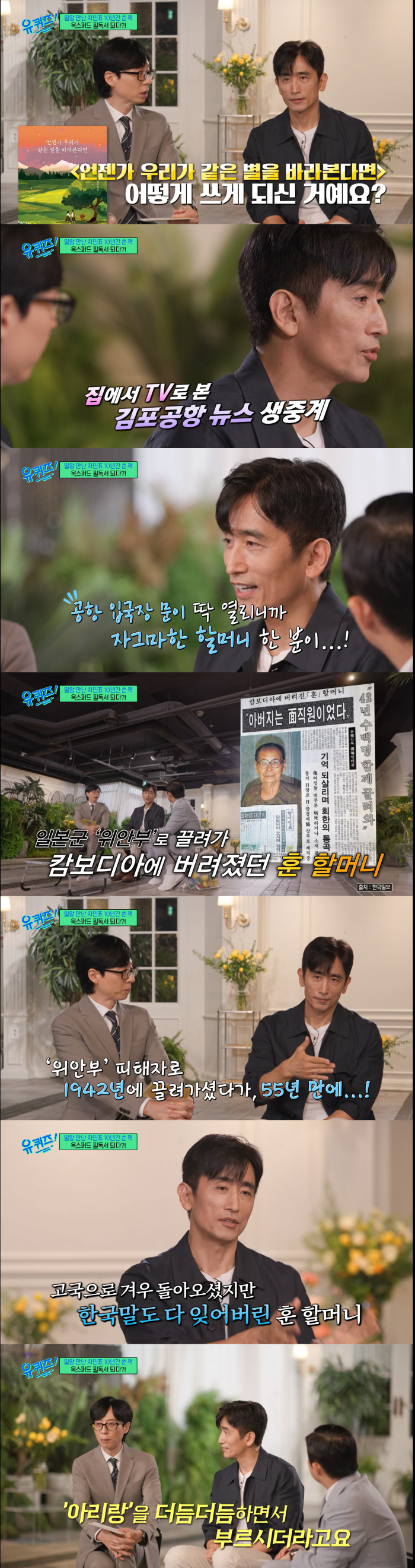차인표는 "당시 여성들이 일본군 '위안부'로 끌려갔던 나이가 열여섯, 열입곱이다. 실제로 훈 할머니도 본인 증언에 의하면 열여섯 때 모내기하고 있던 마을에서 짐 싸서 나가봤더니 동네 온 처녀들이 가득했다고 하더라. 그렇게 15일 배를 타고 가니 싱가포르에 도착했다"라며 "사람이 정말 존귀한데 그런 취급을 받은 역사가 우리나라에 있었다. 가슴이 아프고 지키지 못한 부끄러움이 있다"고 덧붙였다.