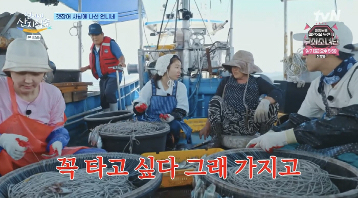 이를 들은 차태현은 "대단한 기술이다. 사람을 오도가도 못하게 한다. 그렇다고 기분이 좋지도 않다"고 했고, 안은진은 "이게 바로 산지라이팅이다"며 웃었다. 이어 조업을 준비, 서서히 낚싯줄이 감겨 올라오고 갯장어 등장에 멤버들은 놀랐다. 특히 안은진은 크고 난폭한 갯장어에 경악한 반면 염정아는 "나는 괜찮다"며 장인 실력을 뽐냈다.