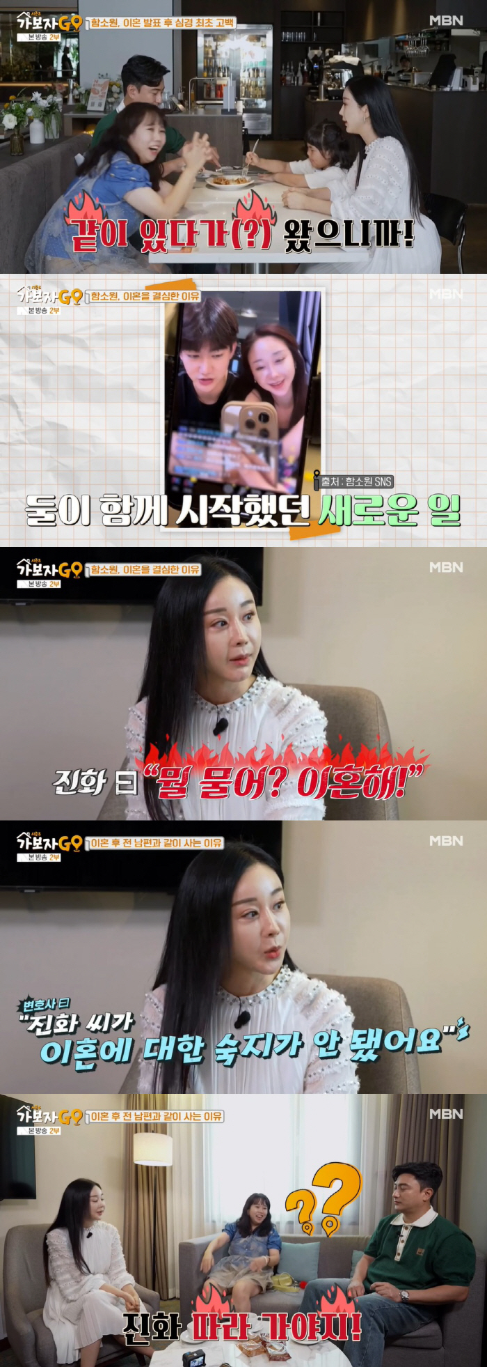 하지만 둘 사이 변화는 없었고 함소원은 결국 2022년 12월 법원에 이혼 서류를 제출했다. 함소원은 "저는 친정엄마, 혜정이와 베트남으로 갈 예정이었는데 변호사에게 전화가 왔다. 진화 씨가 이혼에 대해 숙지가 안 됐다고 하더라. 진화 씨와 대화해 보니 아직 이혼을 받아들일 자신이 없다고 했고 저도 당장 헤어지기 겁났다. 이후 진화 씨가 베트남에 쫓아오겠다고 해서 저도 말리지 않았다"라고 말했다. 홍현희는 "같이 사는 게 힘들어 이혼하는건데?"라며 의아해했고 함소원은 "원래 방 2개짜리 집을 구하려고 했는데 급하게 방3개 짜리 집으로 구했다"라고 말했다.