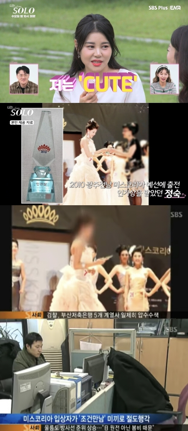 30일 방송된 SBS Plus, ENA '나는 솔로'에서는 솔로나라 23번지에 입성한 솔로남녀들의 모습이 그려졌다. 이날 가장 관심을 받은 출연자는 정숙이었다. 정숙은 2010년 광주, 전남 미스코리아 예선에 출연해 인기상을 받았다며 과거 사진을 공개했다.