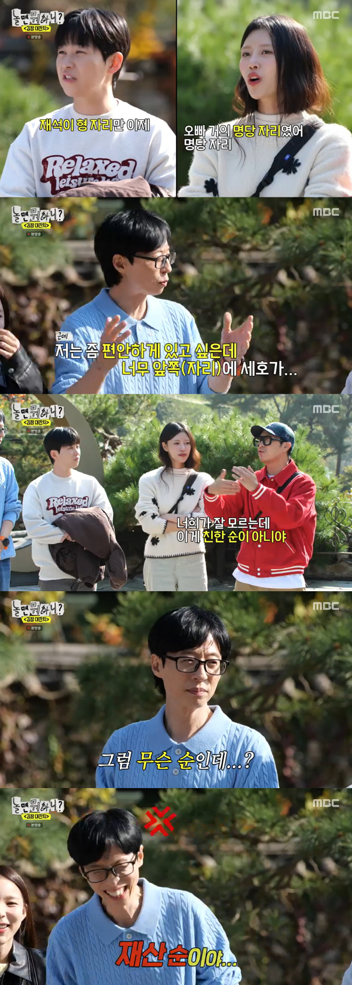 다만 유재석 자리는 결혼식장 명당 자리였다고. 유재석은 "저는 좀 편안하게 앉고 싶었는데 너무 앞쪽에 자리를 배치해줬다"라고 이야기했고, 이에 하하는 "너네가 잘 몰라서 그렇다. 이게 친한순이 아니다. 재산순이다. 돈 많이 모아라"라고 말해 웃음을 자아냈다.