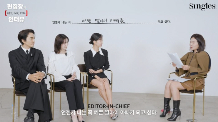 마지막으로 송승헌은 사전 질문에 언젠가 꼭 이쁜 딸아이 아빠를 하고 싶다고 적었다. "어제 어떤 저녁 자리가 있었는데 선배 형 핸드폰을 봤더니 딸내미 사진이더라. 지금 결혼할 나이이기도 하고 그게 너무 부러웠다"라고 말했다.