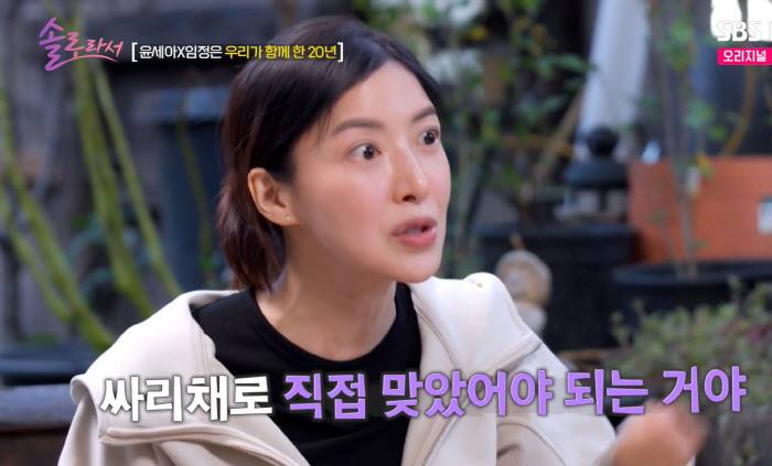 윤세아는 "내가 카메라 울렁증 있을 때 너가 많은 위로가 됐다. 특히 '궁녀' 촬영할슌 종아리가 피가 터지게 진짜 싸리대로 맞았다. 그때는 진짜 슌렸다. 종아리가 얇아서 대역을 구하기 쉽지 않았다. 맞아서 피가 텨졌다. 껍데기가 터지기 직전까지 맞았다. 제작부가 미안한지 상처에 소고기를 붙이라고 줬는데 난 니가 밥을 먹으러 갈줄 알았다. 밥도 안먹으러 가고 소고기를 붙여줄슌 감동받았다"고 했다.