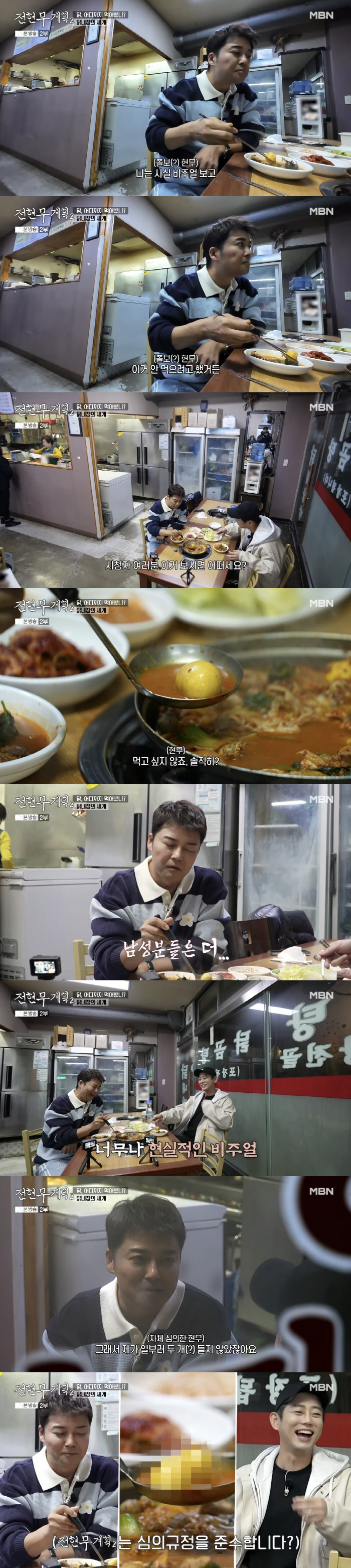 다만 걱정도 잠시, 전현무는 닭내장탕 국물을 한입 맛보고는 "캬"하며 감탄, "닭볶음탕이랑 맛이 다르다. 눅진하다"라고 평가햇다.
