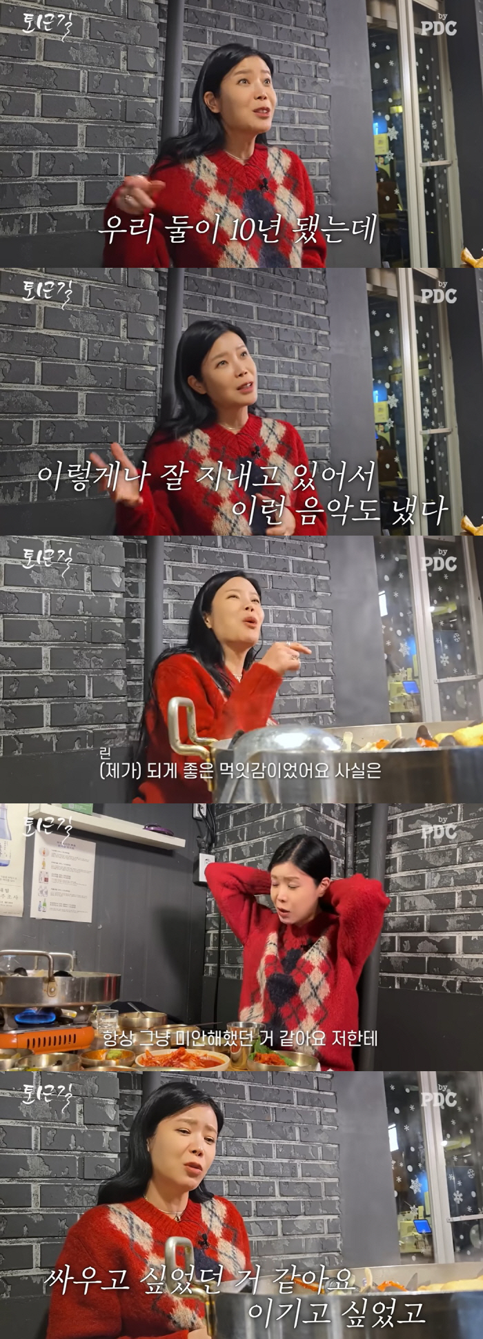 린은 "(활동하는 동안) 그렇게까지 아픔은 없었던 것 같다"라는 말에, "아픔이라고는 할 수 없는데 결혼하면서부터 그런 게 제게 생겼다. 결혼하고 나서는 일부러 슬픈 노래는 안 부르려고 한다. 사랑. 이별 노래는 안부르려고 애를 쓴다. 지금은 천 마디 말보다 사실 음악으로 말하고 싶다"라고 말했다. 이어 "우리 둘이 결혼한지 10년이 됐는데 이렇게 잘 지내고 있고 이런 음악도 했다는 걸 보여주고 싶어서 상징적으로 음원을 낸 거였다"라며 지난해 10월, 이수와 함께 발매한 듀엣 앨범을 언급했다.