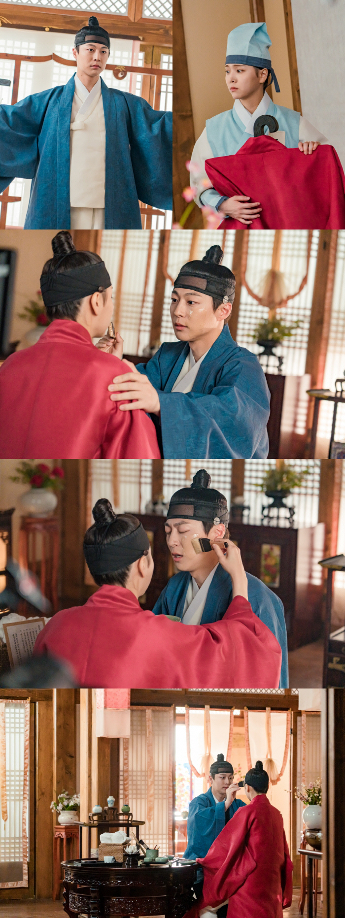 먼저 첫 번째 사진 속 이은호는 당당하게 푸른색 침의를 입고 있고, 이은호 앞에서 옷을 갈아입기가 난처한 홍덕수는 붉은색 침의를 들고 걱정 어린 표정을 짓고 있다. 이어 둘 다 침의로 갈아입고 나서는 서로의 얼굴에 팩을 해주고 있어 눈길을 끈다. 과연 이들이 신혼부부 행세를 하게 된 이유는 무엇일지 호기심도 증폭시킨다.