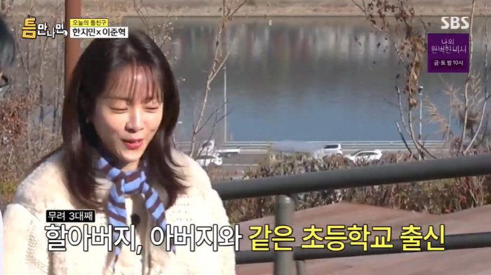 이후 틈 친구를 만나기 위해 이동, 그때 '흑석동 토박이'라는 한지민은 "할아버지랑 아빠랑 저랑 다 같은 초등학교 나왔다. 고모들과 언니들도 다 나왔다"며 뿌리 깊은 '동작구의 딸' 면모를 드러냈다.