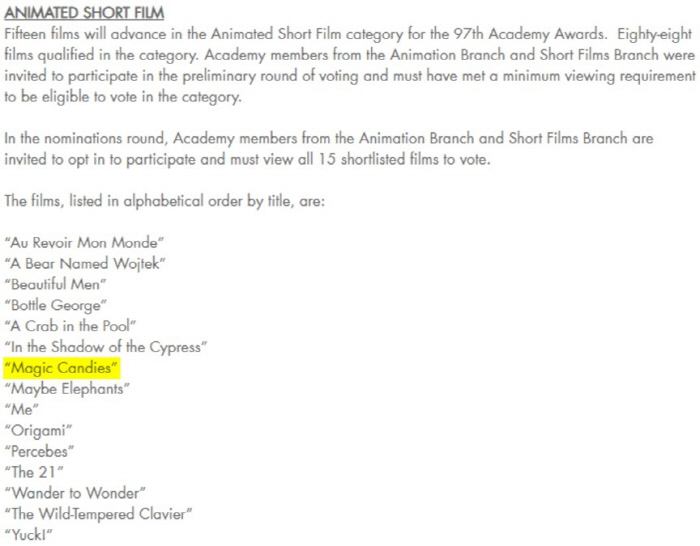 '알사탕'이 예비후보로 이름을 올린 아카데미 시상식 단편 애니메이션 부문에는 총 15작품이 선정되었다. 최종 후보는 8일부터 13일까지 이루어지는 아카데미 회원 중 애니메이션 및 단편 영화 관계자들의 투표를 통해 선정되며, 17일 발표를 앞두고 있다.