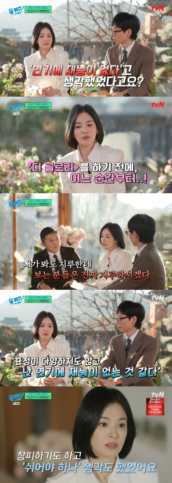 이에 유재석은 "살면서 본인 스스로에게 자책하게 되는 순간 엄청 자책하게 되지 않냐. 송혜교 씨에게도 그런 계기나 시기가 있었냐"라고 물었다.