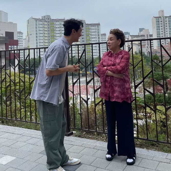 사진 속에는 故 김수미와 신현준의 다정한 모습이 담겨있다. 이는 지난 2022년 6월 영화 '귀신경찰' 촬영 당시의 모습이다.