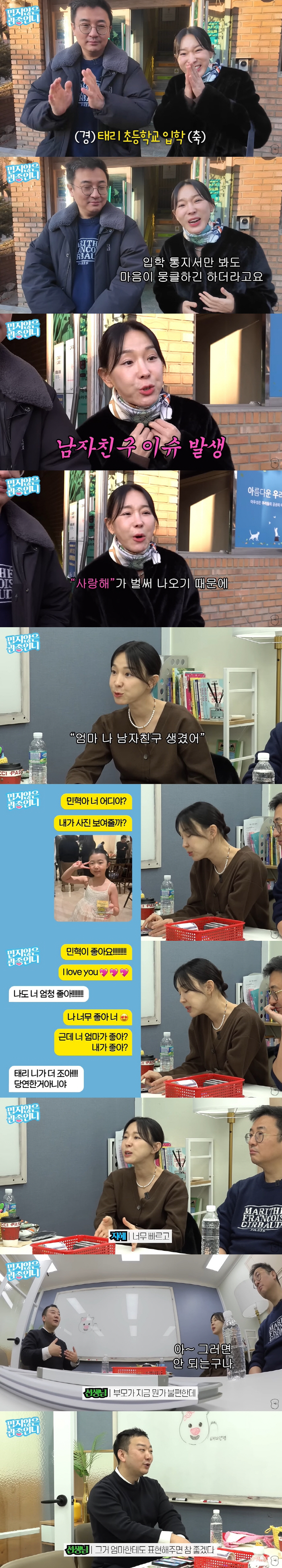 이후 이지혜는 선생님을 만나 "조금 충격을 받았던 게 진짜 아기인 줄만 알았는데 갑자기 태리가 '나 남자친구 생겼다'고 하더라"며 태리가 남자친구와 보낸 문자를 공개했다. 태리는 남자친구에게 셀카와 댄스 영상과 함께 "민혁이 좋다"며 사랑을 고백했다.