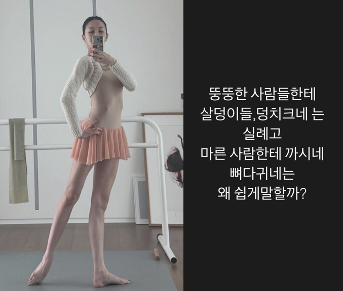 윤혜진은 10일 "뚱뚱한 사람들한테 '살덩이들, 덩치 크네'는 실례고 마른 사람한테는 '가시네, 뼈다귀네'는 왜 쉽게 말할까?"라고 다소 불편한 심경을 전했다.