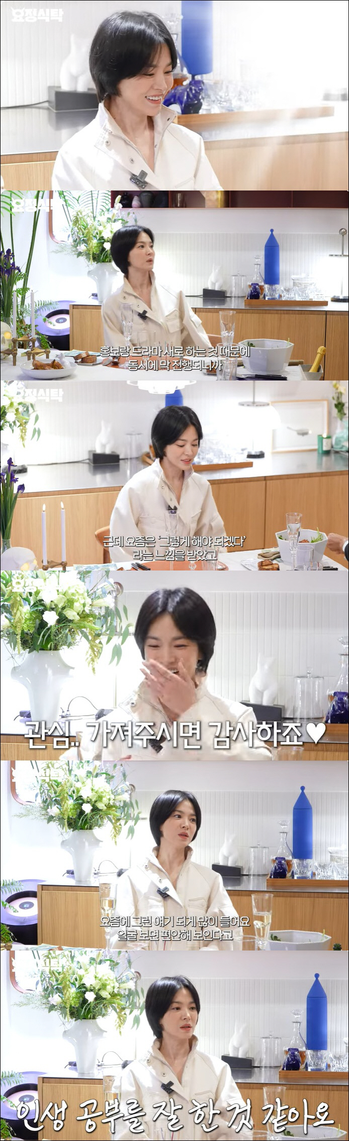 정재형은 "예전엔 정말 아기였다면 지금은 되게 편안해 보인다. 아까 들어오는데 되게 편해 보여서 깜짝 놀랐다"고 말했고 송혜교는 "요즘에 그런 얘기 많이 듣는다. 되게 편해 보인다고. 많은 일들도 살면서 좋은 경험들도 많이 했고 여자로서, 배우로서 힘든 경험들도 있어서 행복한 경험들도 있었고 여러 가지 경험들을 다 해서 인생 공부를 잘한 거 같다"고 밝혔다.
