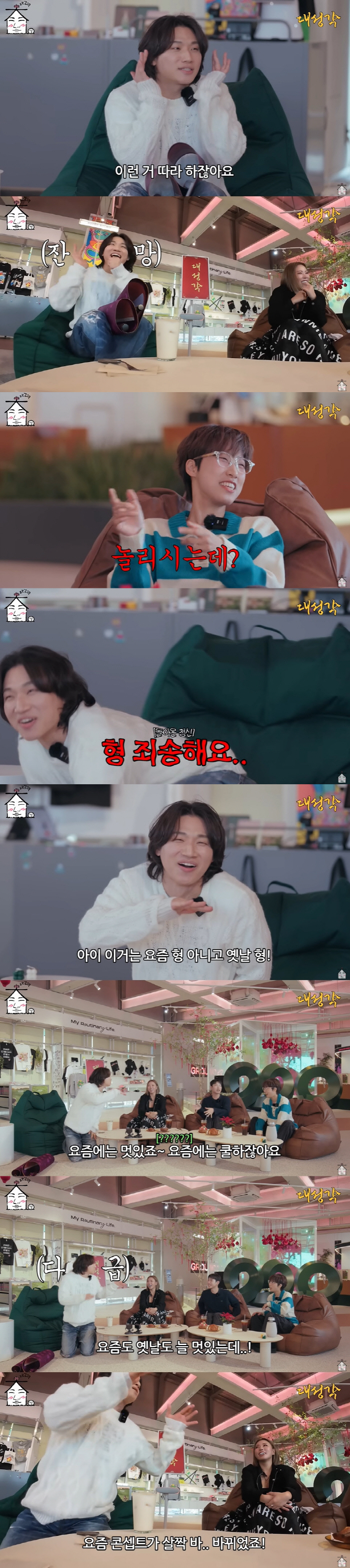 이에 재재는 "놀리시는데?"라고 하자, 정신이 돌아온 대성은 "형 죄송하다"라며 바로 무릎을 꿇고 사과했다. 대성은 "이거는 요즘 형이 아니고 옛날 형이다. 요즘에는 멋있다. 요즘에는 쿨하다"고 했지만, 재재는 "요즘에는?"이라고 지적했다.