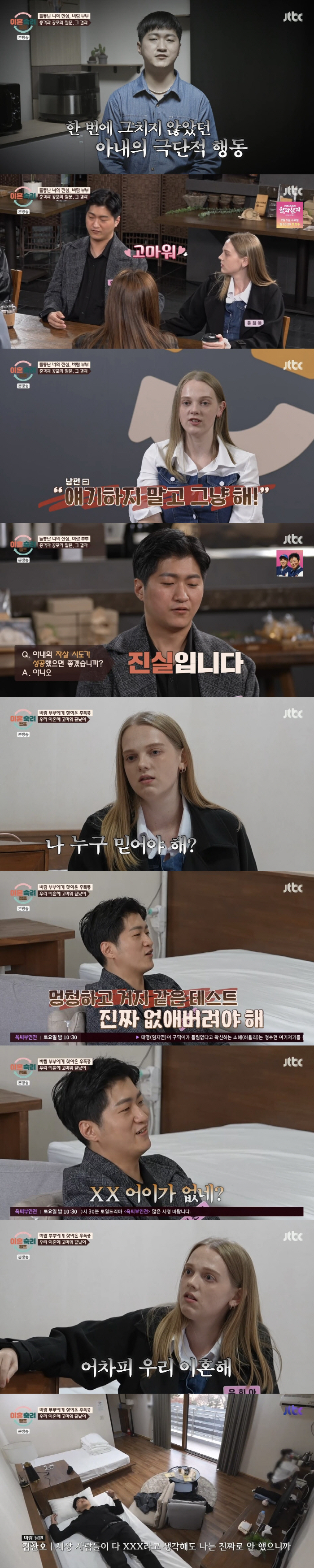 신뢰가 바닥난 두 사람. 결국 남편은 "어이가 없다"면서 되려 화를 내기 시작하더니 "멍청하고 거지 같은 테스트 진짜 없애버려야 한다"고 했다. 그러던 그때 남편이 갑자기 아내 앞에서 무릎을 꿇고는 사과했지만, 아내는 결국 방을 나가버렸다.