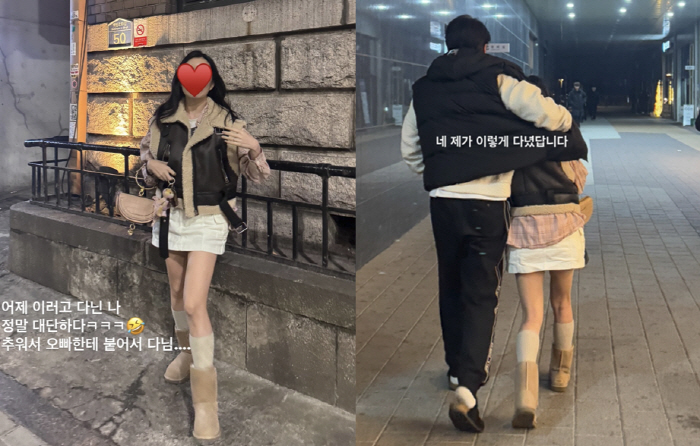 아야네는 17일 "어제 이러고 다니 나. 정말 대단하다. 추워서 오빠한테 붙어서 다님"이라며 사진을 게재했다.