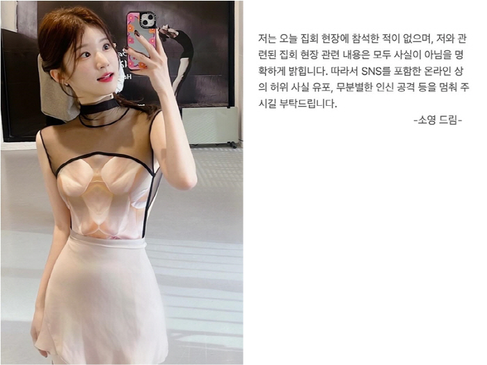 애꿎은 피해자까지 발생했다. 박소영 MBC 아나운서는 윤석열 대통령 구속영장 발부에 반대하는 시위에 참석했다는 루머에 휩싸였다. 이에 박 아나운서는 "저는 오늘(19일) 집회 현장에 참석한 적 없다"면서 "저와 관련된 집회 현장 관련 내용은 모두 사실이 아님을 명확하게 밝힌다. 따라서 SNS를 포함한 온라인상의 허위사실유포, 무분별한 인신공격 등을 멈춰주시길 부탁드린다"고 했다. 고재완 기자 star77@sportschosun.com