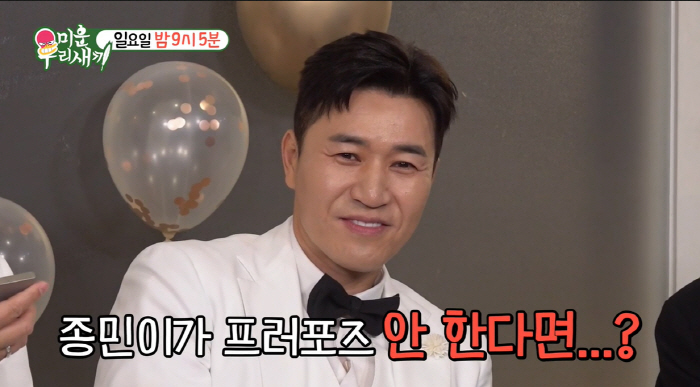 김희철은 "종민이 형의 어디가 그렇게 좋으냐"고 물었고 김종민의 예비 신부는 "오빠가 듬직하고 스윗하고 사랑꾼이다"라고 칭찬했다.