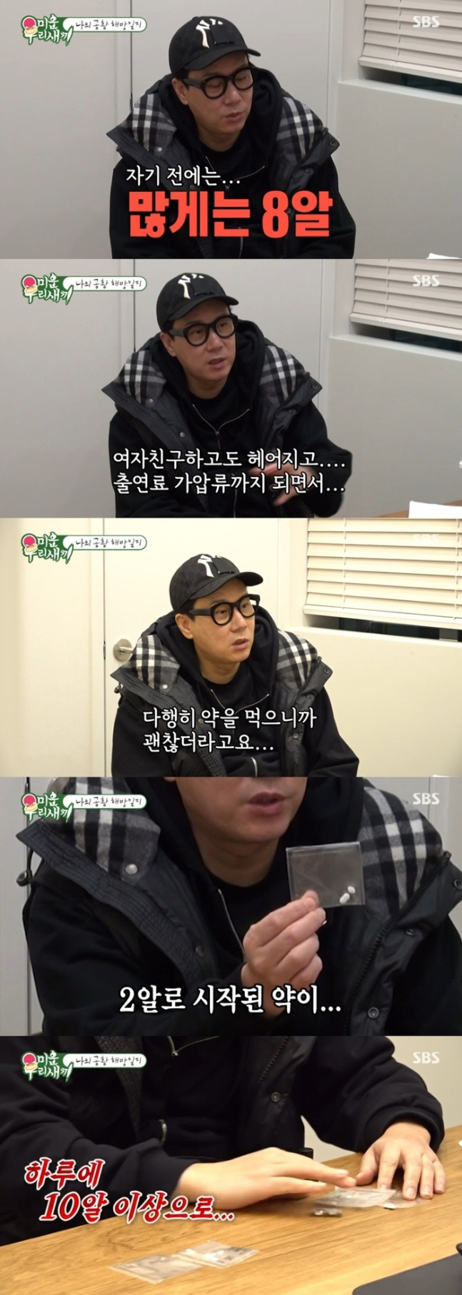 이어 "10년 동안 약 양이 상당히 늘었다. 처음에는 하루 2알로 시작했다. 그런데 요즘은 자기 전 많으면 8알까지 먹는다. 하루 먹는 약 양이 10여알 이상으로 늘었다"고 말했다.
