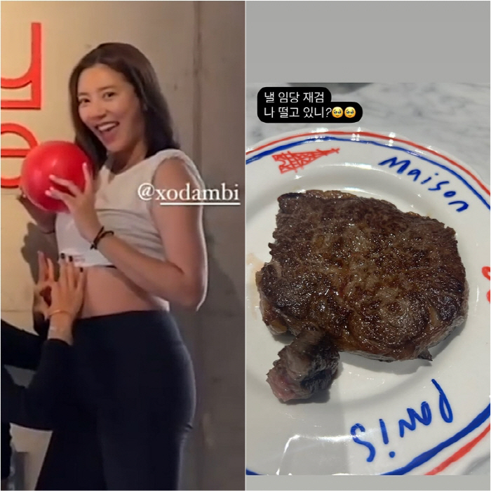 사진 속 손담비는 크롭티를 입은 채 임신 7개월 차의 D라인을 웃으며 공개했다. 그는 또 스테이크 사진을 공유하며 "낼 임당 재검, 나 떨고 있니?"라는 글을 올리기도 했다.
