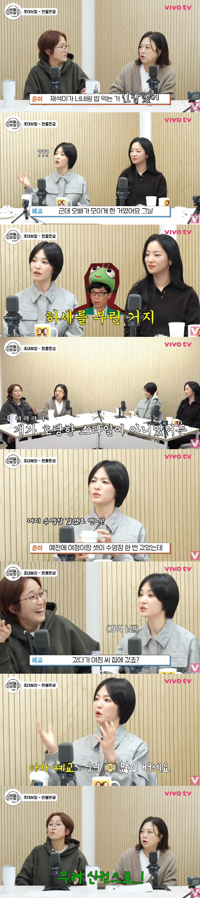 이에 당시 패밀리 레스토랑을 함께 갔던 송은이는 "걔는 기억을 못하더라. 아마 긴장했었을거다. 내 기억이 맞다면 재석이가 너네랑 밥 먹는 거 긴장했다"고 하자, 송혜교는 "근데 그날 오빠가 모이게 한 거였다"고 했다.