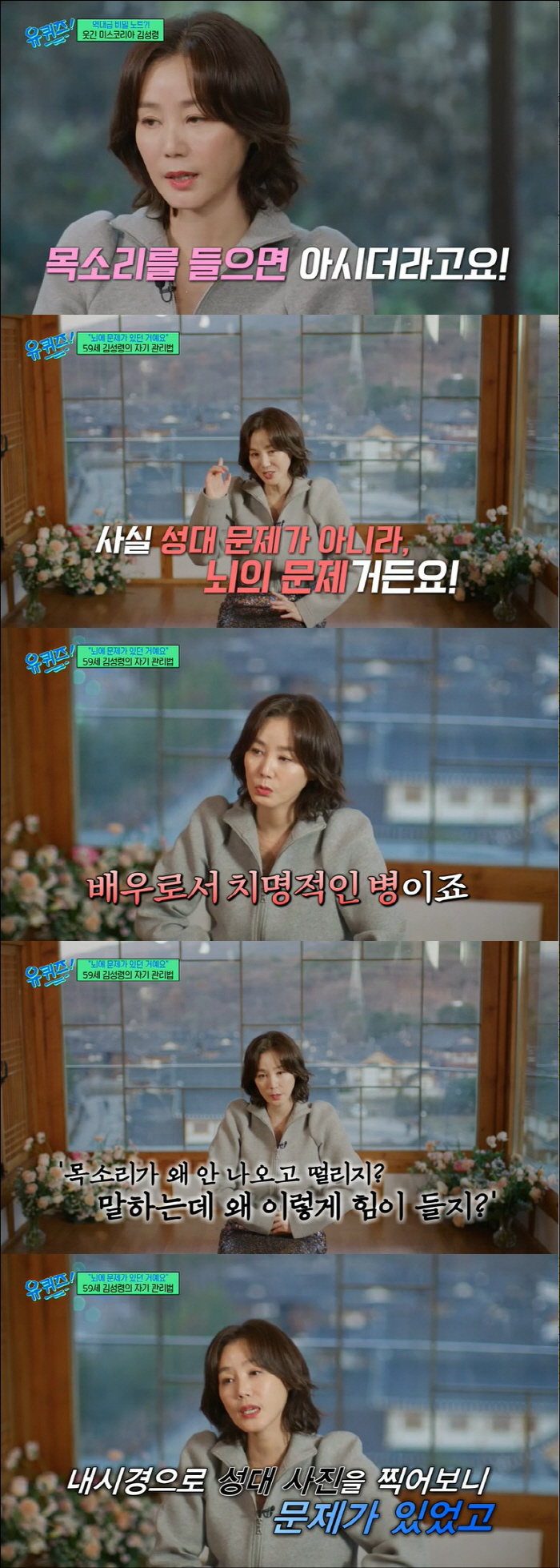 [스포츠조선닷컴 이우주 기자] '유퀴즈' 김성령이 발성장애를 15년째 앓고 있다고 고백했다.