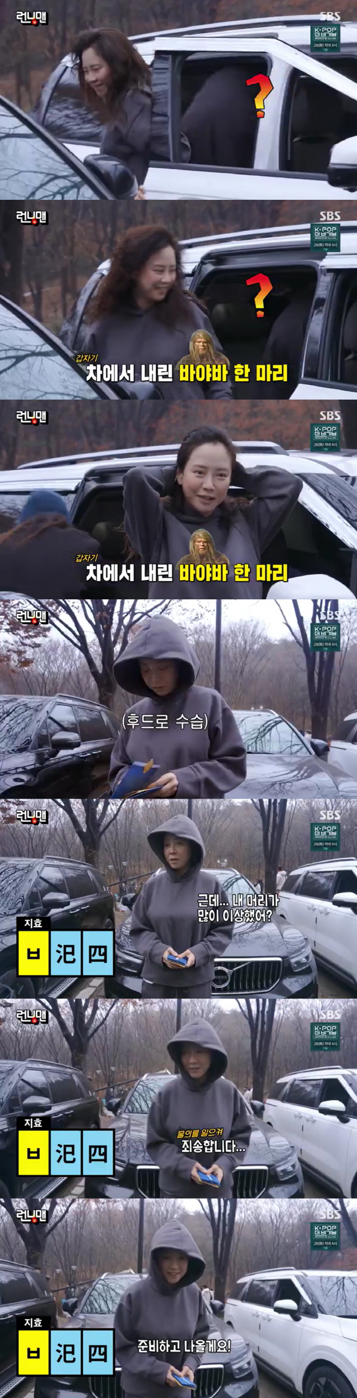 결국 송지효는 후드티에 달린 모자를 뒤집어 쓰고는 "근데 내 머리가 많이 이상했어?"라고 물은 뒤 "죄송합니다. 준비하고 나올게요"하고 사과했다.