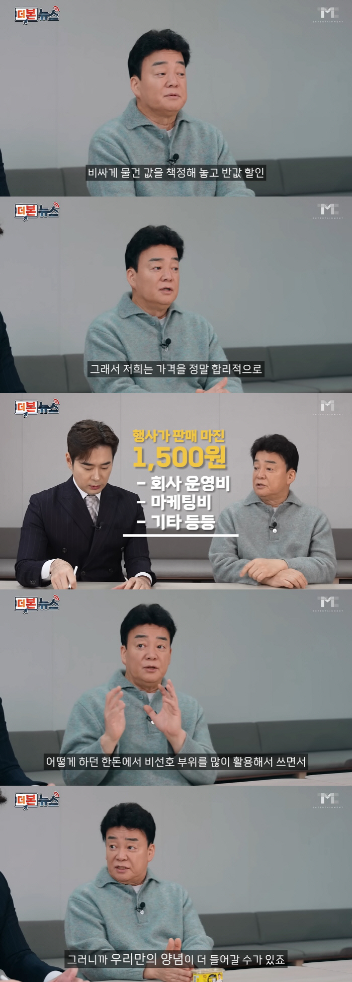또 45%로 파격 할인 행사를 한 것에 대해서는 "9개 묶음 한 세트당 약 1500원이 남는다"라며 회사 운영비, 마케팅비, 기타 등 비용을 빼야 한다고 했다. 백종원은 "햄을 만든 취지가 한돈 비선호부위를 많이 활용해서 한돈 농가에 도움을 주자는 거였다. 마진과 상관없이 선물세트로 많이 알려보자는 취지에서 한 거다. 떳떳하게 말씀드린다. 45% 할인 행사는 마진이 거의 없다"라고 짚었다.