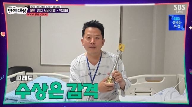 29일 서울 상암동 SBS 프리즘타워에서 열린 '2024 SBS 연예대상'에서 김준호는 '미운 우리 새끼'와 '신발 벗고 돌싱포맨' 등에서 활약한 공로를 인정받아 명예사원상의 영예를 안았다. 하지만 그는 직접 무대에 오르지 못하고 병실에서 환자복 차림으로 상을 받는 이례적인 장면을 연출했다.