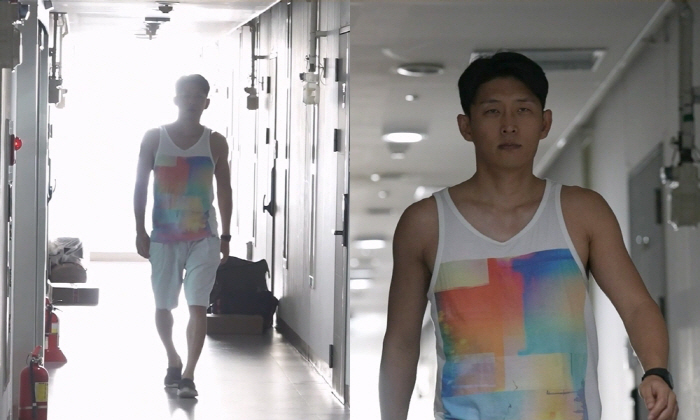 급기야 집 밖으로 나온 고준은 민소매와 반바지 차림으로 복도를 런웨이 삼아 워킹 연습을 시작한다. 스마트폰으로 워킹 자세를 촬영하는 고준. 어둠 속 그의 비장미 넘치는 표정과 걸음마다 켜지는 복도 조명 효과까지 더해진 그의 실루엣이 어딘가 으스스한(?) 분위기를 만들어낸다.