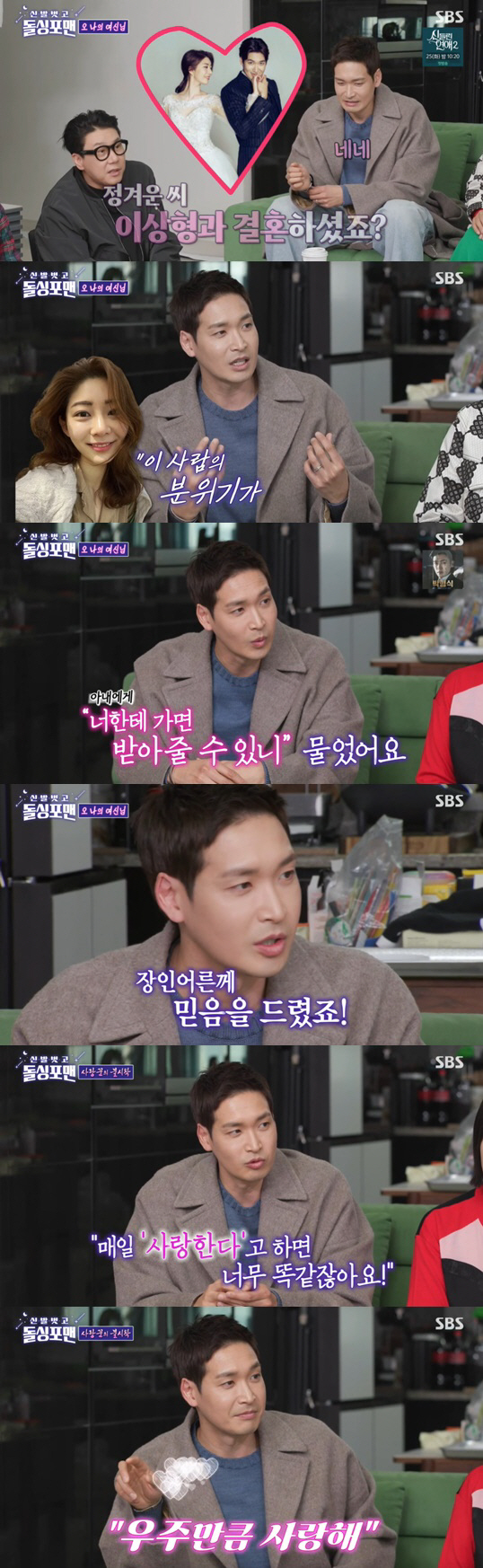 '일산 여신'으로 소문난 아내와 '새혼'에 성공한 정겨운은 "모임에서 만났다. 아내를 본 순간 '이 사람 아니면 안되겠다' 싶더라. 아내의 분위기가 너무 좋았다. 솔직히 외모가 예뻤다. 아내는 저랑 다른 성격이다. 당당하고 자신감 넘쳤다"고 밝혔다.