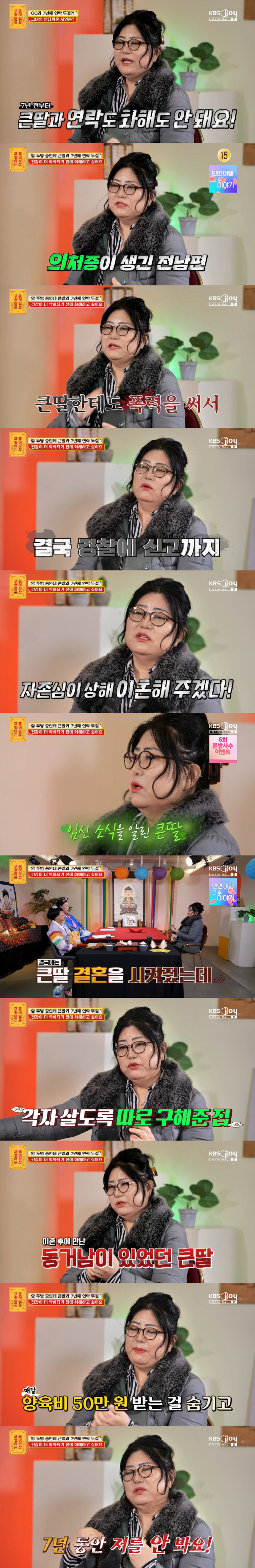 이후 큰 딸이 이혼을 하고 만난 동거남이 있다는 사실을 알게 된 사연자. 큰 딸은 전남편에게 50만 원 양육비를 받는 사실을 숨기고 동거남에게 생활비를 받고 생활했다고. 이런 사실을 모르는 큰딸의 동거남에게서 '장모님'이라고 부르는 메시지를 받게 된 사연자가 '내가 왜 네 장모냐. 애 아빠한테 양육비도 받고 있는데'고 하자, 이후 큰 딸이 아이의 친아빠에게서 양육비를 받고 있다는 사실을 언급하며 이후 7년 동안 연락이 끊어졌다고.