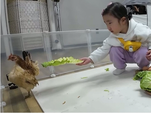 이날 지우는 별안간 거실 한복판에 등장한 닭을 보고 놀라지 않고, 금세 친구가 되는 폭풍 친화력을 보여준다. 지우는 "저것 봐. 닭이 '따라랑' 해"라며 닭이 몸단장하는 모습을 '따라랑'이라고 표현, 닭의 몸짓을 싱크로율 100%로 따라 하는 섬세한 관찰력으로 웃음을 선사한다. 지우는 닭에게 모이를 줄 때도 "좋은 생각이다! 이걸로 싸서 줘볼게"라며 흡사 고기를 배추에 싸 먹는 것처럼 배추 안에 밀웜을 넣은 '밀웜 배추쌈'을 탄생시킨다고. 지우는 닭이 먹이를 잘 먹지 않자 "꼬꼬야, 너 왜 말을 안 듣니?"라며 작은 한숨을 푹 쉬며 말썽꾸러기 남동생 탓에 진땀 빼는 누나와 같은 모습으로 폭소를 자아낸다.