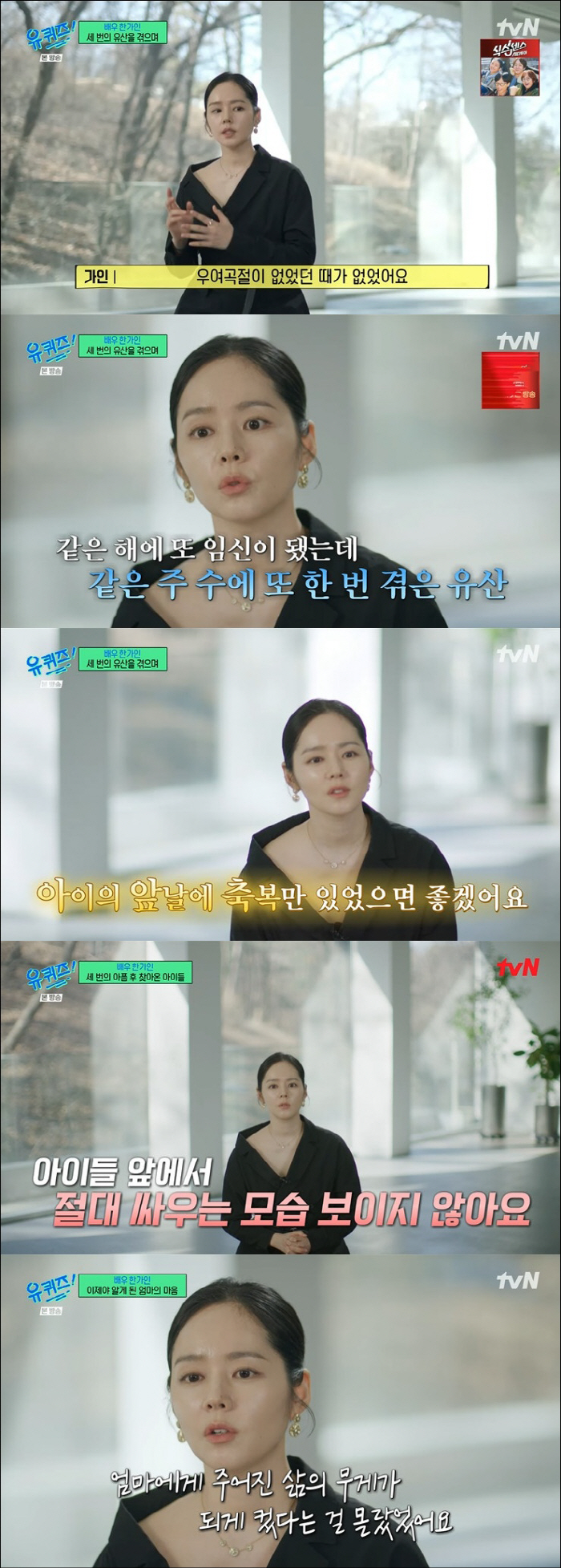 한가인은 "바깥에서 볼 땐 위기 없이 잘 지낸 거 같지만 우여곡절이 없었을 때가 없었다"며 유산의 아픔을 고백하기도 했다. 한가인은 "임신 8주쯤 됐을 때 아기가 유산됐다. 처음에는 얼떨떨했는데 괜찮았다. 그러다가 같은 해 겨울에 또 임신이 됐는데 같은 주수에 같은 이유로 유산이 됐다. 한 해의 세 번을. 그땐 진짜 무너지더라. 남편이랑 둘이 엄청 힘들었다"고 털어놨다. 마지막으로 도전한 시험관에 성공해 두 아이를 품은 한가인. 한가인은 "진짜 다 해주고 싶고 이 아이의 앞날에 축복에 있었으면 좋겠다. 언젠가는 저를 떠나갈 수 있으니까 그때를 위해서 차곡차곡 가르쳐줄 것도 많다"고 아이들을 향한 애정을 드러냈다.