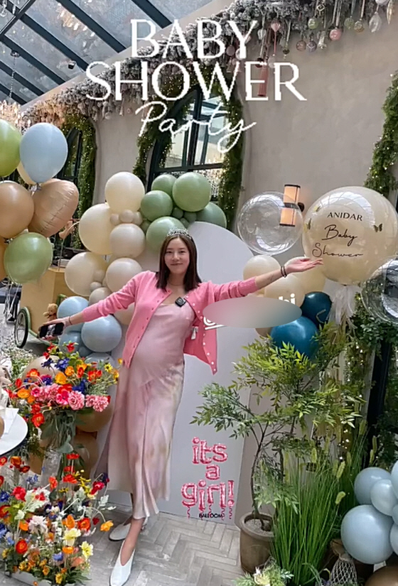 다양한 풍선과 꽃으로 예쁘게 꾸며진 장소를 배경으로 사진을 촬영 중인 손담비. 예비 딸 엄마인 손담비. 이에 이날의 의상 콘셉트는 핑크인 듯 연한 핑크 원피스에 핑크 가디건을 매치한 스타일링을 선보였다. 여기에 왕관을 착용, 핑크 여왕님으로 변신했다. 얼굴에는 행복한 미소가 가득했다. 특히 손담비는 곧 출산을 앞둔 만큼 볼록 D라인을 자랑하고 있어 눈길을 끈다.