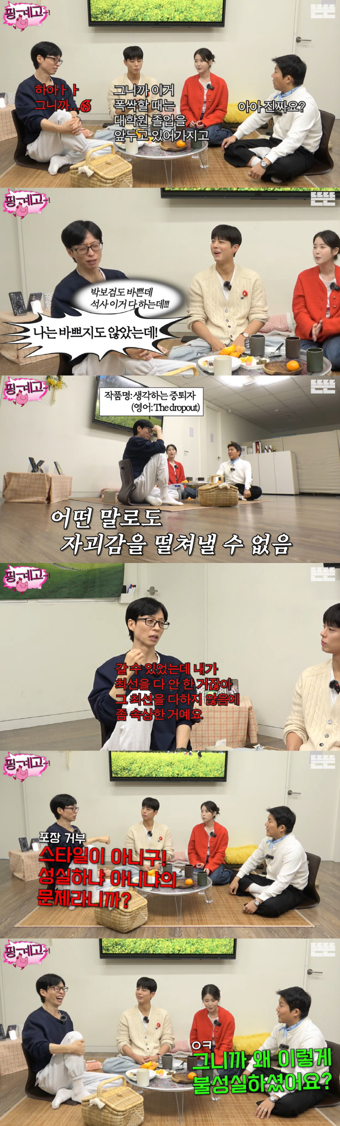 서울예대를 중퇴한 유재석은 "박보검도 바쁜데 석사 다 하는데 난 바쁘지도 않았는데"라며 깊은 한숨을 쉬었다. 이에 박보검은 "선배님이 얼마나 바쁘셨냐"며 위로했고, 조세호도 "그때랑은 시대가 다르지 않냐"고 말했다.